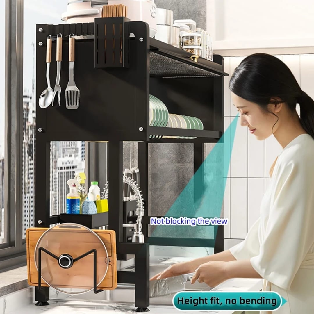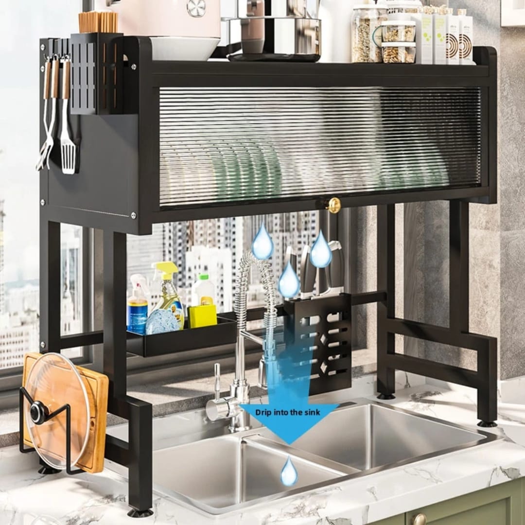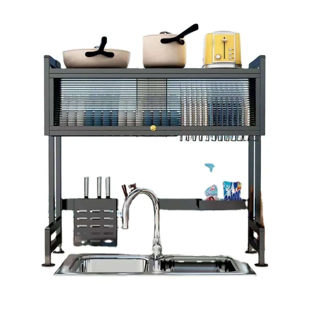 Égouttoir robuste en métal avec grande capacité, armoire fermée et crochets pour ustensiles. Idéal pour une cuisine propre et organisée.