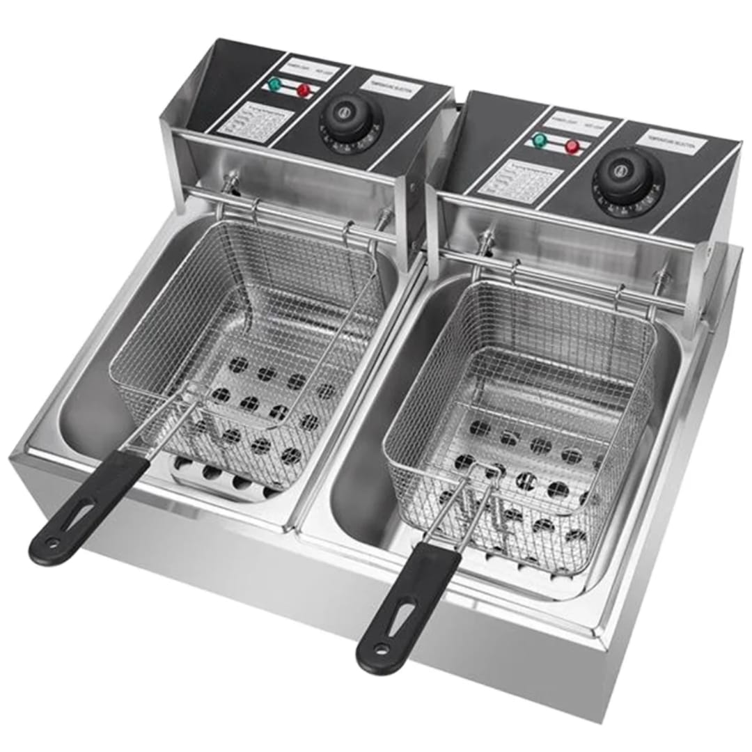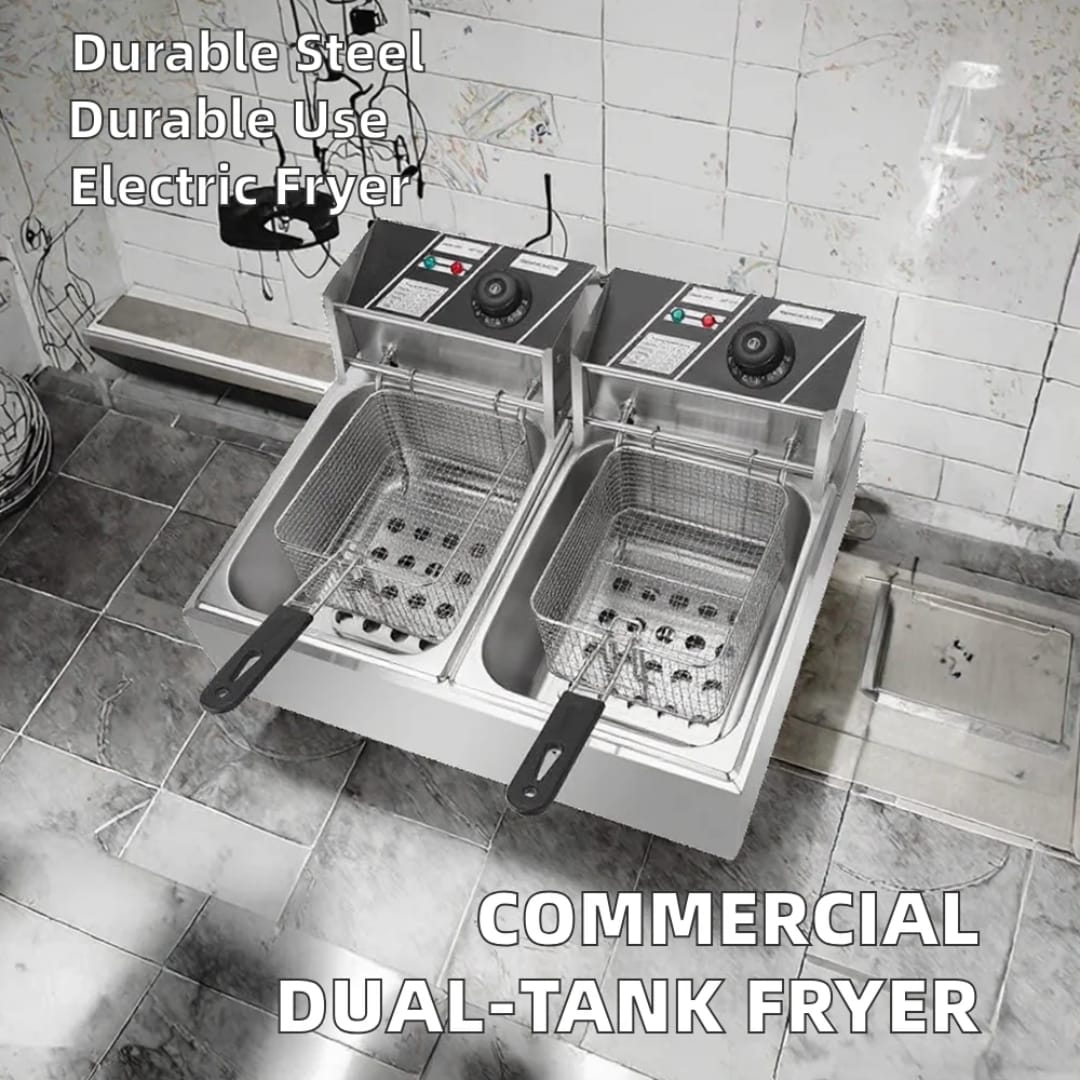 Optimisez votre production avec cette friteuse électrique double cuve en acier inoxydable, idéale pour restaurants, snacks, fast-foods et événements.